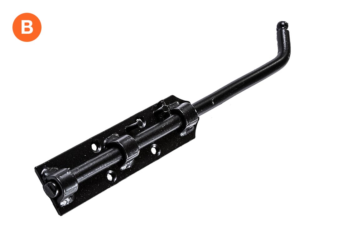 Pasador forjado con apoyo chato y perno redondo, utilizado generalmente en portones o rejas para trabar una de las hojas al piso. Fabricados en dos formatos en varias medidas desde 15 a 50cm, con material tipo planchuela de 32x3 y 38x5mm, con pernos de 9 y 12mm respectivamente. Todas las terminaciones están realizadas con una protección de pintura negra de inmersión, para evitar la corrosión.